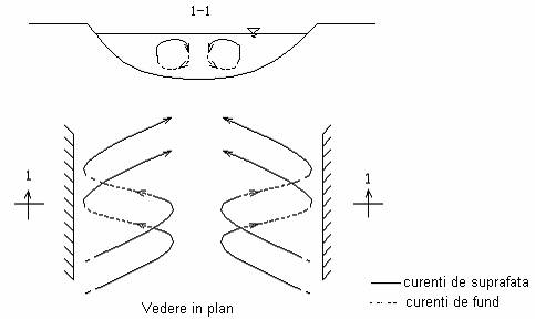 Compunerea curentilor transversali cu cei longitudinali da nastere la o miscare elicoidala, care in functie de concavitatea malului drept sau stang are sensul acelor de ceas sau sens invers.