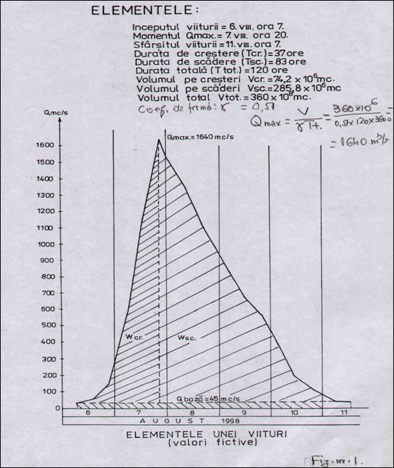 d.Debitul de baza al viiturii - debitul cu care incepe si (uneori) sfarseste viitura. Dupa cum am aratat, debitul de sfarsit popate fi de 1,5 - 2,0 ori mai mare. In situatii mai complexe se recomanda ca debitul de baza sa fie considerat ca fiind egal cu de 2 ori debitul mediu multianual.