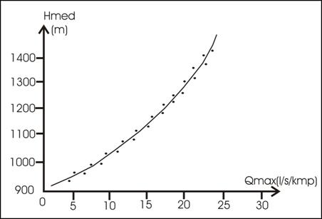 a.Corelatiile dintre scurgereas specifica maxima (qmax in l/sec/km2) si altitudinea medie a bazinului hidrografic (Hm, in m).