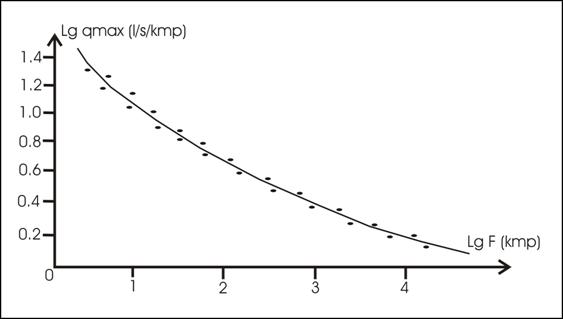 b.Corelatia logaritmica dintre scurgerea specifica maxima (qmax in l/sec/km2) sim suprafata bazinului hidrografic (F in km2).