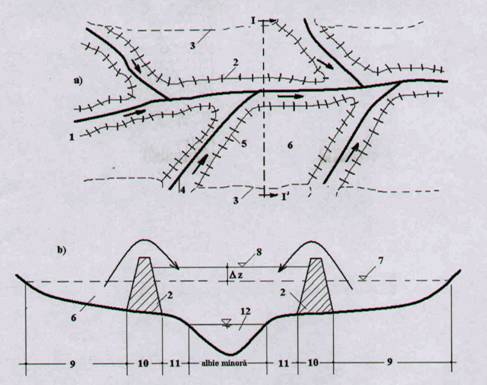 a)vedere in plan; b)sectiuni transversale; 1.cursul principal; 2.diguri longitudinale; 3.terase; 4.afluenti; 5.diguri de remuu; 6.incinta; 7.nivel maxim in regim natural; 8.nivel maxim in regim indiguit; 9.zona interioara; 10.ampriza digului; 11.zona exterioara (dig - mal); 12.albia minora; Δz, suprainaltare datorata indiguirii.