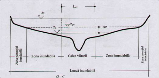 Zona inundabila care corespunde nivelului maxim (Zcv = z1 + Δz) se determina tot prin calcule hidraulice caredau pana la urmavaloarea Δz. In formule se introduce Qmax de calcul si se obtine Δz.