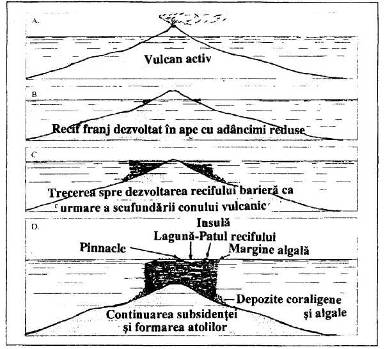 Fig.3. Teoria lui Darwin despre formarea insulelor vulcanice si a recifilor coraligeni (dupa Thurman, 1988)