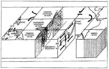 Fig. 8. Sectiune verticala prin Oc.Atlantic si schema desfasurarii curentilor tropicali de suprafata si de adancime (dupa Philander, 2002)