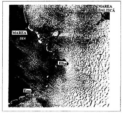 Fig. 9. Marea Nordului: cu alb sunt reprezentate insulele si barele nisipoase; cu gri sunt. reprezentate suprafetele tidale (estranul); cu negru sunt figurate apele marii si estuarelor