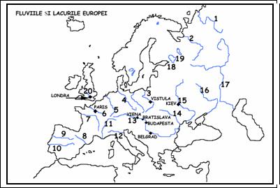 Identificati de pe harta fluviile notate cu cifre de la 1 la 17 si 20 precum si lacurile marcate cu 18 si 19 si scrieti-le pe caietele voastre.