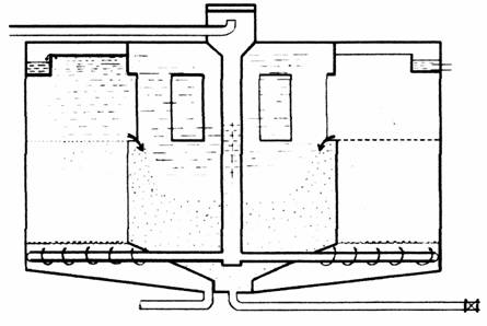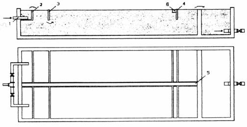 Apa intra in separator prin conducta de intrare 1 si este distribuita pe intreaga latime a separatorului cu ajutorul deversorului 2 si a sicanei semiscufundate 3.