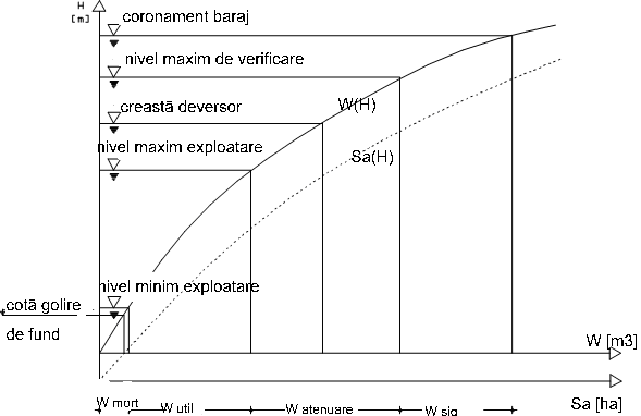 Pentru aceasta, in afara cunoasterii hidrografului viiturii mai este necesara si curba caracteristica W(H) (volumul apei in lac in functie de cota) din care se va folosi doar partea de la cota crestei deversorului in sus (corespunzatoare inmagazinarii volumului de atenuare).