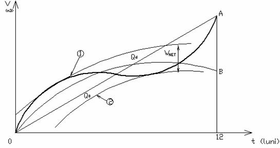 Pe curba integrala de mai sus s-a determinat volumul util net (Wnet) in cazul unei regularizari anuale complete la care debitul necesar consumatorilor si asigurarii debitului de servitute a fost uniform (constant) si egal cu Q0 (debitul mediu al raului) ; determinarea a constat in ducerea de tangente paralele cu directia debitului livrat din lac - Qo - in punctele de maxim si de minim ale curbei integrale a debiteloir afluente si masurarea pe verticala - la scara hotarata pentru volume - a distantei intre aceste tangente, care este chiar Wnet.
