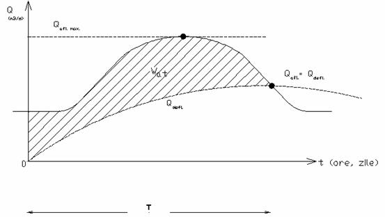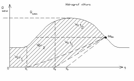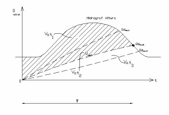 Pe figura ce reprezinta hidrograful viiturii se traseaza cateva ipotetice debite deversate in aval pana in punctele 1,2,3.. Corespunzatoare debitelor maxime deversate. Se calculeaza pentru fiecare caz volumul Wat (hasurat pe desen). Se traseaza cu valorile calculate curba Wat(Qd max).