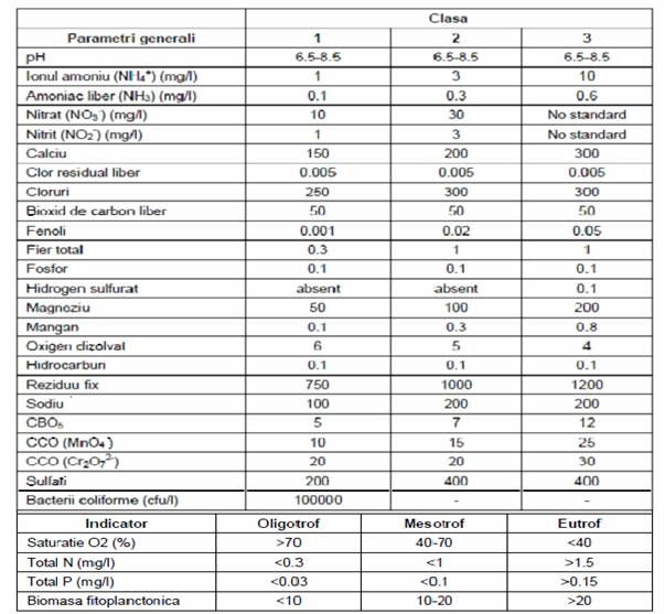 Limite pentru fiecare categorie sunt stabilite in directiva pentru pestii de apa dulce, in directiva pentru captarile din ape de suprafata si in standardele romanesti actuale.