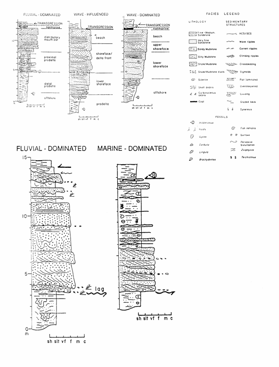 faciesurile de 'point bar' bazal sau de canal bazal trec la 'mouth bar sands', 'levee' (nisipuri si silturi), si la nisipuri litorale (shoreface);