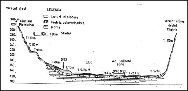 d) Terasele. Din anumite cauze climatice sau tectonice, uneori, raurile sunt obligate sa-si schimbe profilul longitudinal, prin adancire. Toate aceste procese sunt deosebit de complexe si de durata si au avut ca efect formarea mai multor terase (pana la 8-10).