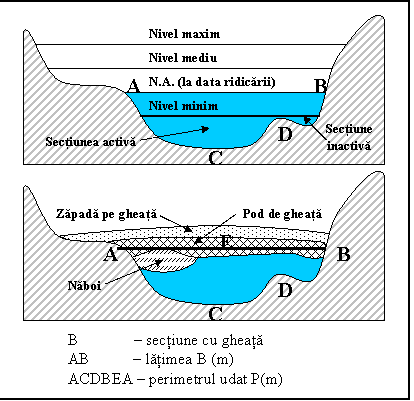 In cazul existentei fenomenelor de inghet, perimetrul udat P este reprezentat atat prin linia fundului cat si prin linia fetei inferioare a formatiunilor de gheata. In cazul podului de gheata, P este aproape dublu decat in perioada cu albie libera.