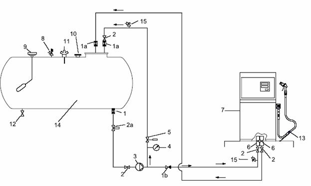 4B. Scheme de principiu de sistem subteran (ingropat, acoperit) de depozitare si distributie a autogazului (schemele de principiu sunt corelate cu recomandarile din prEN 14678-2) a. Cu pompa de transfer la suprafata