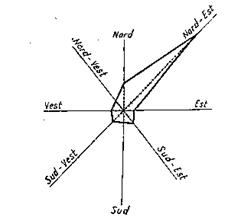 In modelul de grafic trasat pe roza vanturilor - fig. 2 - pe cele patru axe, s-a notat, la o scara convenabila, numarul de zile in care vantul a batut din aceeasi directie.