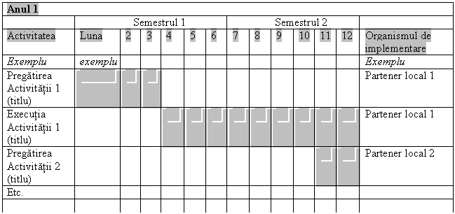 Durata actiunii va fi de 16 luni Nota: Planul de actiune indicativ nu trebuie sa mentioneze date exacte, ci numai luna 1 , luna 2 etc. Se recomanda solicitantilor sa pastreze o marja de siguranta in calendarul de activitati, ca masura de precautie. Planul de actiune nu trebuie sa includa descrieri detaliate ale activitatilor, ci numai titlul lor (asigurati-va ca acestea coincid cu titlurile prezentate in sectiunea 1.7). Orice luna in care nu se desfasoara activitati trebuie inclusa in planul de actiune si in durata de derulare a actiunii. Planul de actiune pentru primul an de implementare trebuie sa fie suficient de detaliat incat sa ofere o imagine de ansamblu asupra pregatirii si implementarii fiecarei activitati. Planul de actiune pentru fiecare din anii urmatori (in functie de durata actiunii) poate fi mai general si poate enumera doar principalele activitati programate pentru intervalul respectiv. Un plan de actiune mult mai detaliat pentru fiecare din anii care urmeaza va fi depus inainte de primirea noilor transe de finantare, in conformitate cu Articolul 2 (1) din Conditiile Generale (vezi Anexa E la Ghidul Solicitantului). Planul de actiune trebuie elaborat in urmatorul format: