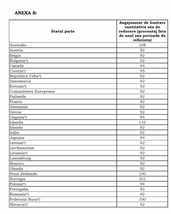 Valoarea angajamentului de reducere a emisiilor de GHG adoptat de Romania este de 8% in perioada 2008-2012 fata de anul de baza 1989. Protocolul de la Kyoto a intrat in vigoare la nivel international la 16 februarie 2005. Protocolul de la Kyoto permite Partilor, care l-au ratificat, sa-si indeplineasca angajamentele de reducere a emisiilor de GHG combinand politicile si masurile interne cu trei mecanisme flexibile, si anume: