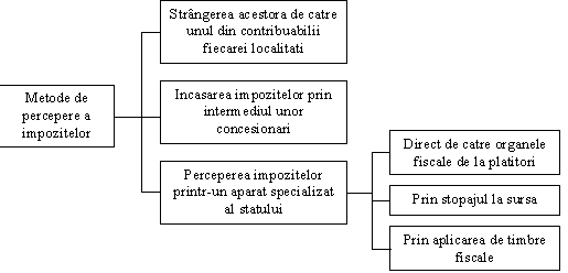 Dupa determinarea marimii impozitului, organele fiscale trebuie sa aduca la cunostinta contribuabililor atat cuantumul impozitului datorat statului, cat si termenele de plata a acestuia si ulterior se trece la incasarea lui. In timp, s-au utilizat mai multe metode de percepere a impozitelor, cum sunt: