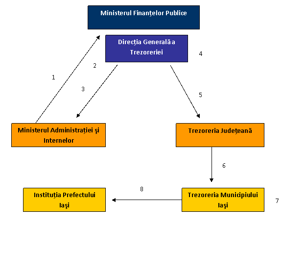 Trezoreria Municipiului Iasi alimenteaza cu fondurile solicitate contul Institutiei Prefectului Iasi, informand despre alimentarea contului. Din acest moment, Prefectura poate efectua plati.