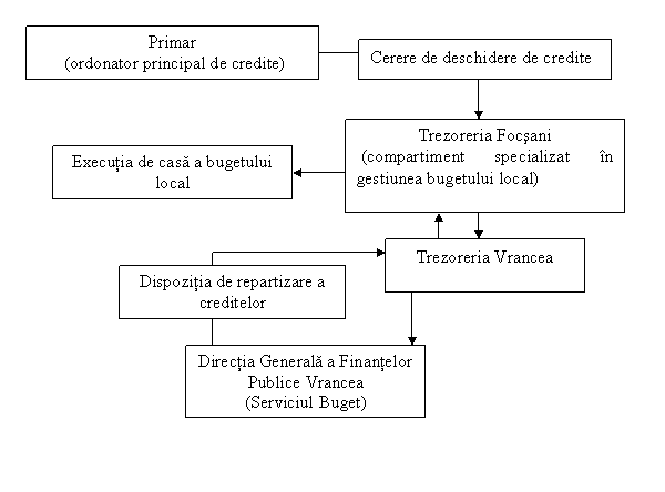 Dupa aprobarea data de Serviciul Buget din cadrul Directiei Generale a Finantelor Publice Judetene, un exemplar din dispozitia de repartizare a creditelor ajunge, prin directia judeteana de trezorerie, la trezoreria locala unde primaria isi are deschise conturile.