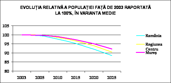 Astfel, conform prognozei si datorita cauzelor mentionate, la nivelul judetului Mures se previzioneaza, in varianta medie, in intervalul 2003-2025, o scadere absoluta de 45 300 persoane, adica -7,7%,judetul Mures aflandu-se astfel pe locul al-3-lea la nivelul Regiunii in functie de prognoza evolutiei populatiei pe perioada 2003-2025.