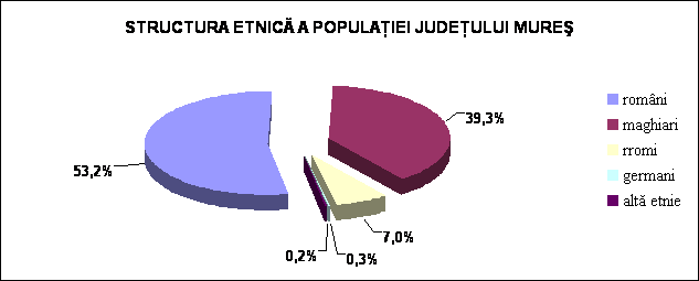 Exista zone, in judetul Mures in care majoritatea este constituita din populatia de etnie maghiara, iar in ceea ce priveste populatia de etnie rroma judetul Mures concentreaza cel mai mare numar de rromi, atat la nivel regional cat si la nivel national. Fata de recensamantul anterior, la nivelul judetului Mures, se remarca scaderea populatiei de etnie germana (-0,5%) si maghiara (-2,1%), consecinta a valului de emigrari din anii 90 si a sporului natural negativ si cresterea numarului persoanelor de etnie rroma (+2,7%), rezultat al sporului natural ridicat, specific acestei etnii.