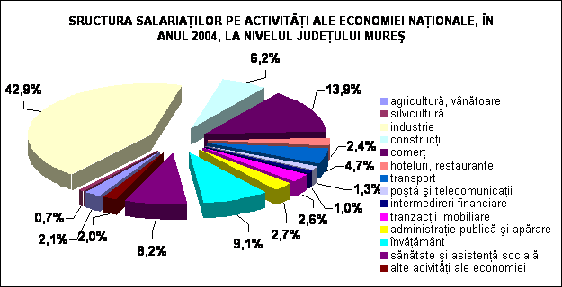 Scaderi insemnate ale numarului de salariati in perioada 1999-2004 s-au inregistrat in principalele ramuri ale economiei nationale: agricultura(- 43,6%), industrie (- 9,6%), cresteri importante ale salariatilor fiind inregistrate in: comert (+24,9%), tranzactii imobiliare si alte servicii (+50,4%), administratie publica si aparare(+25%) alte activitati ale economiei (+37,8%). Scaderea numarului de salariati din agricultura si industrie poate fi explicata prin restrangerea sectorului de stat ca urmare a incetarii activitatii unor societati sau reducerii efectivelor de salariati ale acestora, astfel crescand numarul de salariati in ramurile enumerate mai sus.