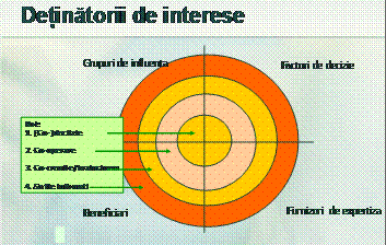 Partenerii constituie numai o mica fractiune din sfera detinatorilor de interese si au un grad de participare mai mare decat detinatorii de interese. In afara de rolul consultativ, partenerii contribuie efectiv la atingerea obiectivului propus prin aportul de capital si/sau resurse proprii. Un exemplu al relatiei dintre parteneri si detinatorii de interese in cazul concret al Parteneriatului socio-economic pentru dezvoltare si angajare construit in Regiunea 4 Sud-Vest Oltenia este reflectata de urmatoarea diagrama: