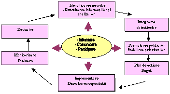 Asa cum este reprezentat in diagrama 2, formularea documentelor strategice de dezvoltare a comunitatilor este un proces ciclic care combina analiza, planificarea, actiunea, monitorizarea si evaluarea, si in mijlocul caruia se centreaza procesele participative: informarea, comunicarea-consultarea si participarea. Procesul de planificare pentru dezvoltarea durabila este un exercitiu interactiv si analitic in care factorii de decizie ii ajuta pe cetateni sa aleaga intre mai multe variante, in vederea alocarii resurselor necesare atingerii obiectivelor agreate[25].