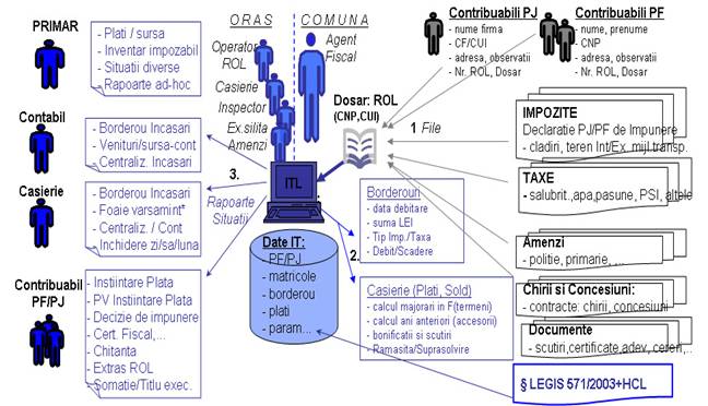 In primariile mici, de obicei comune, rolul Agentului Fiscal este preluat de una sau cel mult doua persoane. Orice persoana fizica sau juridica, proprietar al unei cladiri, unui teren sau mijloc de transport, datoreaza anual impozit pentru acestea. Asadar contribuabilul se prezinta la primarie pentru declararea bunului impozabil sau pentru plata, cu instiintarea de plata, somatie, titlu executoriu (pe care primaria le trimite prin posta). Agentul fiscal deschide un dosar pentru fiecare contribuabil care contine toate datele necesare inregistrarii si urmaririi achitarii impozitelor si taxelor datorate de catre acesta. In urma introducerii datelor prin aplicatia APLxPERT-IT, cele necesare in evidentele agentului agricol pot fi preluate si in baza de date aferenta modulului RA (Registrul Agricol) sau invers, datele deja existente in modulul RA se pot importa in modulul IT al aplicatiei. Dupa introducerea datelor, prin intermediul aplicatiei APLxPERT - IT, se calculeaza sumele datorate conform legislatiei in vigoare, se genereaza chitanta pentru dovada platii, se intocmesc documentele de urmarire si alte situatii necesare desfasurarii activitatii (cu matricole, centralizatoare, suprasolviri, ramasite, majorari, bonificatii), se genereaza borderouri si centralizatoare de debite si incasari necesare evidentelor contabile. In partea de casierie se pot face direct plati pentru datoriile fara debite (ex. amenzi).