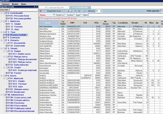 Aplicatia APLxPERT - IT ajuta in desfasurarea activitatii tuturor celor implicati in procesul de stabilire, colectare si urmarire a taxelor si impozitelor datorate de contribuabili, oferind un plus de rapiditate si usurinta in munca, reducand timpul de raspuns la solicitari, prin optimizarea gradului de utilizare a capacitatilor existente si prin furnizarea informatiilor in timp real.