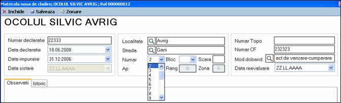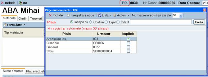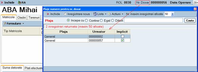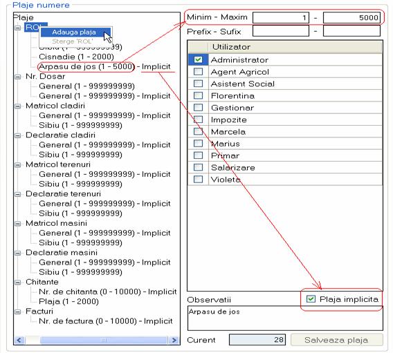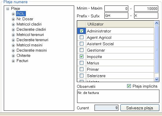 Mai jos exista Plaje numere, unde exista: Plaje ROL, Nr Dosar, Matricol cladiri, Declaratie cladiri", "Matricol terenuri", "Declaratie terenuri", "Matricol masini" "Declaratie masini", "Chitante" "Facturi". Pe partea stanga sunt: "Minim - Maxim de numere" , si Prefix - Sufix, la "Utilizator" se bifeaza in functie de "numele utilizatorului" sau "tip unitate".