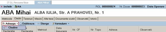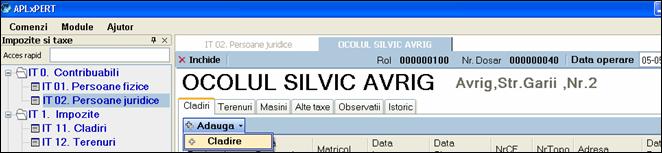 Din lista IT 0. Contribuabili->IT 0.2. Persoane juridice se alege o persoana juridica cum ar fi in exemplul de mai jos "Ocolul Silvic Avrig", unde se introduce o cladire noua prin optiunea Adauga -> Cladiri, similar cu introducerea unui matricol nou cladire persoana fizica, descris in capitolul 3.2 din manual: