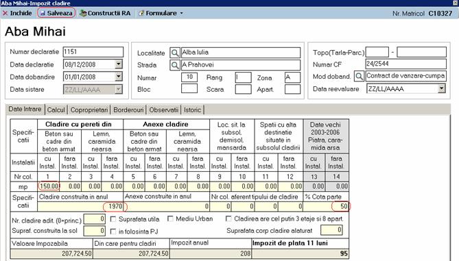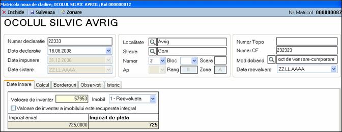 Dupa introducere Data declaratie, Data impunere, Adresa, Nr Topo Nr. CF., Data reevaluare sus se afla butonul "salveaza". Dupa salvare, mai jos se deschide forma de date intrare, in care se completeaza datele specifice impozitarii cladirilor din proprietatea persoanelor juridice, exemplu valoarea de inventar, date referitoare la reevaluare, amortizare :