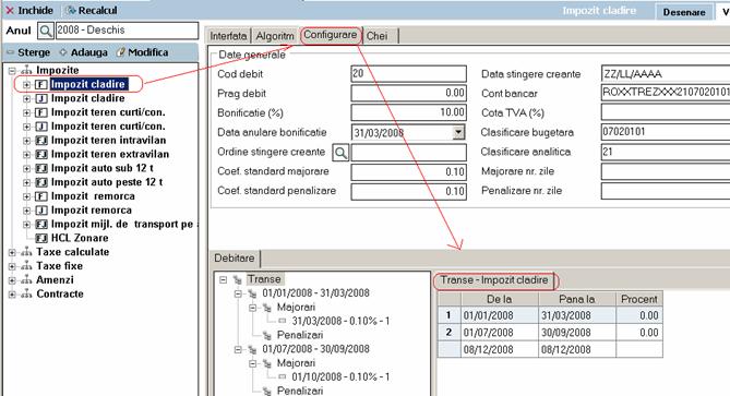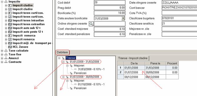 In partea de jos, la Transe, se pot configura transele de plata, respectiv pentru majorari, eventual penalizari, pentru fiecare tip de impozit.