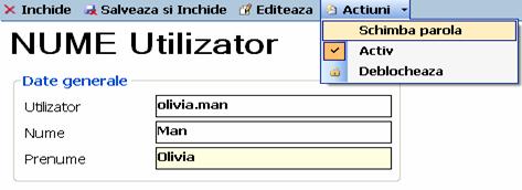 Se intra in aplicatie cu username Admin, iar din meniul Administrare aplicatie -> Acces -> Utilizatori se defineste utilizator aplicatie salarii. Tot de aici, dupa introducere date utilizator, prin meniul Actiuni -> Schimba parola se stabileste parola utilizator.