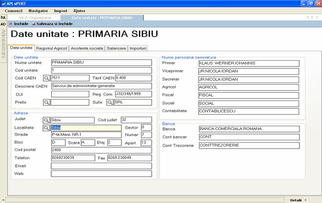 Pentru configurare din Navigator, Administrare Nodul +AD1 Adm. Aplicatie, Setari, si la tabul IT exista tabul Date Unitate. (Imagine 1)