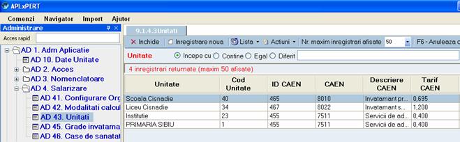 In partea de Administrare Aplicatie se pot completa/modifica si fisierele de nomenclatoare necesare, respectiv :