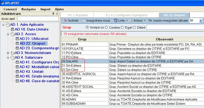 Grupuri : in figura de mai jos se pot observa grupurile predefinite pentru aplicatia de salarii .