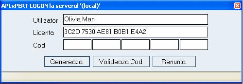 Pentru a activa aplicatia utilizatorul trebuie sa apese butonul "Genereaza Licenta" pentru a genera un cod de licenta. Urmatorul pas este introducerea unui cod unic, pe care il primiti in momentul in care este instalata aplicatia. Fara acest cod de activare aplicatia nu va rula. Dupa introducerea codului de licenta in campul "Cod" se apasa butonul "Valideaza Cod" pentru a activa aplicatia.