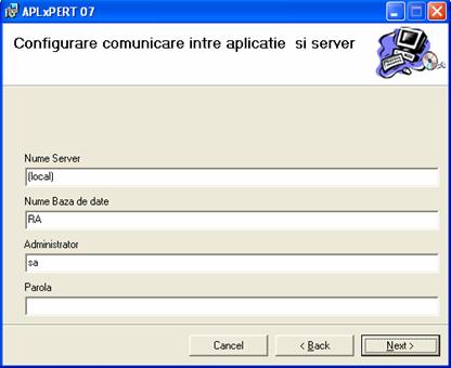 Se introduce numele server-ului bazei de date la care va conectati, baza de date, administratorul si parola; dupa care apasam butonul "Next".