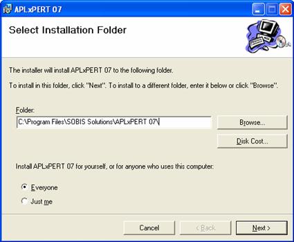 Se introduce calea unde se va instala aplicatia (implicit este "C:Program FilesSOBIS SolutionsAPLxPERT 07"). Tot in pasul acesta se bifeaza si cine poate accesa aplicatia numai dumneavoastra sau oricine foloseste calculatorul.