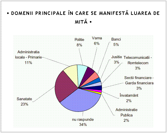 Pentru determinarea modului in care populatia Capitalei percepe amploarea fenomenului de coruptie, subiectilor li s-a cerut sa raspunda la intrebarea: "In ce masura considerati ca luarea de mita este raspandita in Romania?". Opinia dominanta (84,4%) este aceea ca toti sau cei mai multi functionari primesc mita. Peste 7% dintre respondenti au preferat varianta de raspuns mai nuantata: "doar functionarii din anumite domenii iau mita" si au precizat urmatoarele domenii principale in care se manifesta luarea de mita:
