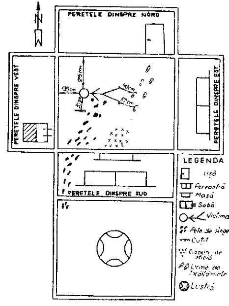 Sunt anuntate organele de urmarire penala si se face cercetarea la fata locului. Pe corpul victimei, numeroase taieturi vadeau furia cu care a lovit agresorul. In holul apartamentului, pe pereti, pe fata interioara a usii de la intrare, pe usile de acces spre baie si bucatarie, precum si pe cele doua fotolii s-au gasit numeroase urme de sange sub forma de stropi, dare sau balta.