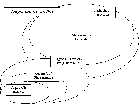 - CJCE are cele mai puternice competente de control in raportul organelor CE intre ele (exemplu: Parlamentul este de parere ca - in procedura de stabilire a normelor de drept - Consiliul nu a tinut seama suficient de drepturile sale de participare ), precum si in raportul dintre fiecare organ, exclusiv pentru totalitatea relatiilor reciproce.