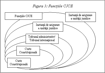 - In raportul dintre organele CE, CJCE joaca rolul unei Curti Constitutionale. In privinta plangerilor functionarilor, acestui rol i se adauga functia unei instante pentru litigii de serviciu, respectiv a unei instante pentru litigii de munca.