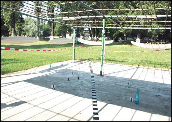Foto nr. 2 Terasa restaurantului "Tomis" unde a fost descoperit cadavrul numitului Vald Ion (nr. 1). Cu jetoane (placute) numerotate sunt indicate urmatoarele: