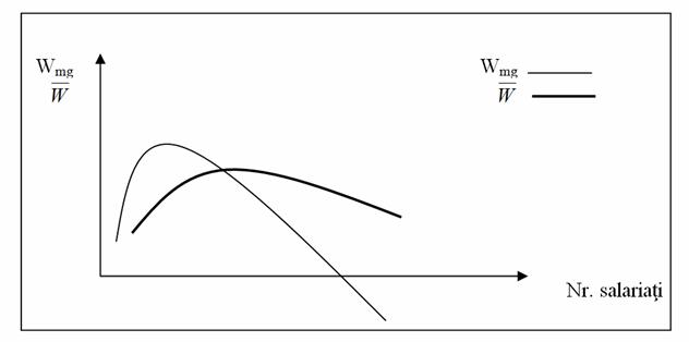 productivitatea marginala creste si scade mult mai repede decat productivitatea medie (ca urmare a faptului ca Wmg tine cont de consecinta ultimei unitati de factor uman utilizat, in timp ce W medie reflecta modul de utilizare a factorului uman in totalitatea sa);