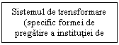 b) Sistemul de transformare in acest caz, pune in evidenta, in raport cu forma de pregatire ceruta, o anumita institutie de invatare care sa permita cresterea gradului de pregatire avand in vedere ca, principala resursa in acest caz o constituie cunostintele. Vom intalni si in acest caz anumite categorii de factori sau forte care vor influenta pozitiv sau negative procesul de invatare, precum si calitatea cunostintelor dobandite.